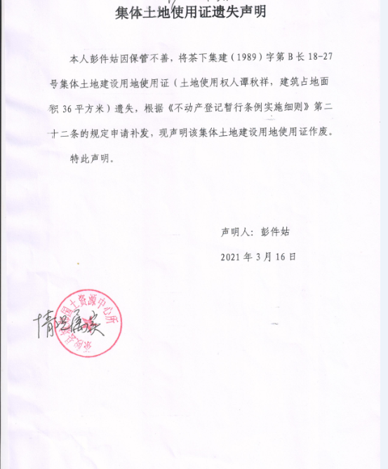 谭秋祥集体土地使用证遗失声明