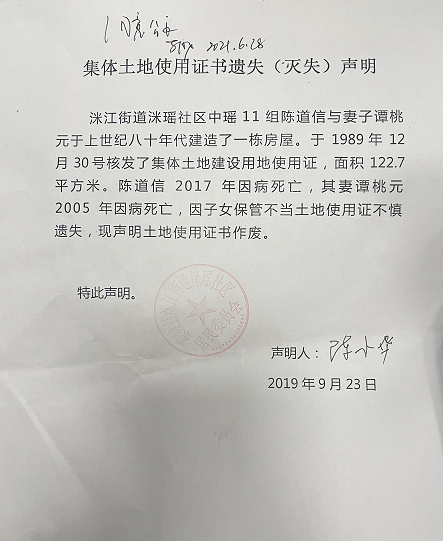 陈道信集体土地使用证书遗失(灭失)声明