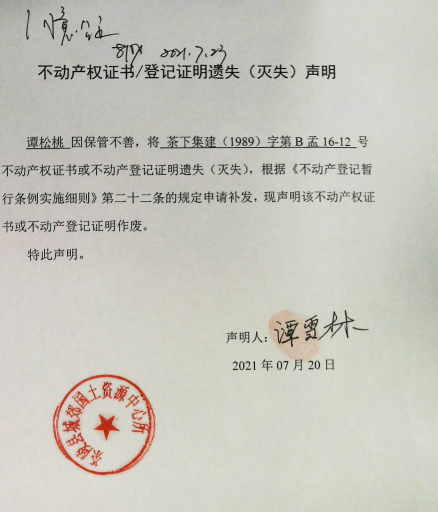 谭松桃不动产证书/登记证明遗失(灭失)声明