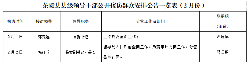 为进一步密切联系群众,畅通信访渠道,依法及时就地解决群众合理诉求,从2022年3月1日开始,茶陵县实行县级领导预约接访制度,每个工作日由县级领导轮流到信访部门公开接访。现将2023年2月份茶陵县县级领导接访安排公告如下: