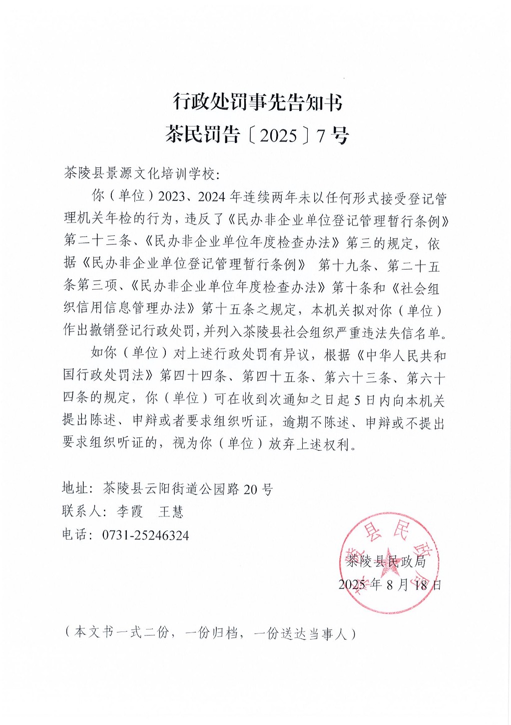 你(单位)2023、2024年连续两年未以任何形式接受登记管理机关年检的行为,违反了《民办非企业单位登记管理暂行条例》第二十三条、《民办非企业单位年度检查办法》第三的规定,依据《民办非企业单位登记管理暂行条例》 第十九条、第二十五条第三项、《民办非企业单位年度检查办法》第十条之规定,本机关拟对你(单位)作出撤销登记。