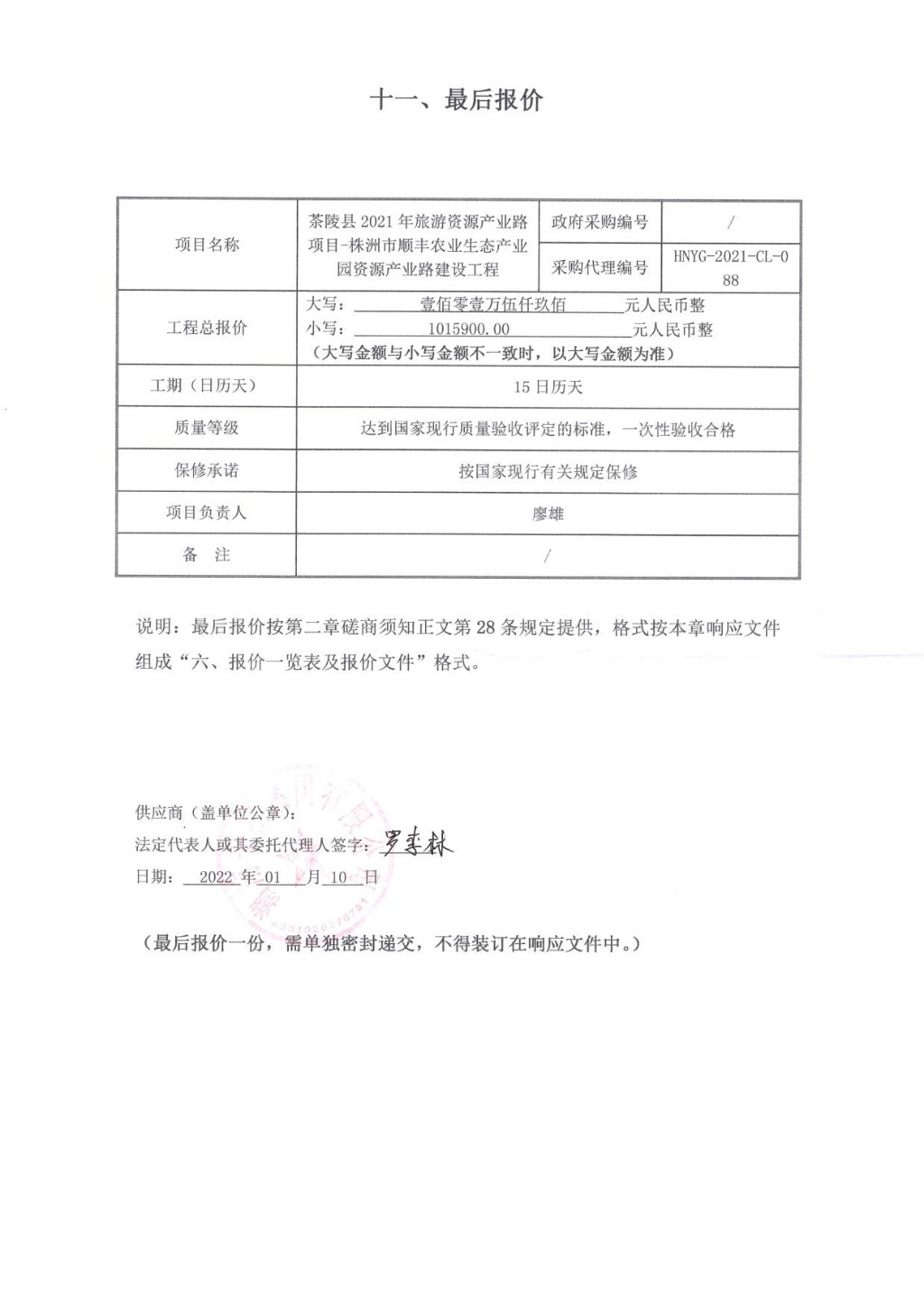 茶陵县舲舫乡长鸭村村民委员会的茶陵县2021年旅游资源产业路项目-株洲市顺丰农业生态产业园资源产业路建设工程于2022年01月11日结束,现将成交结果公告如下: