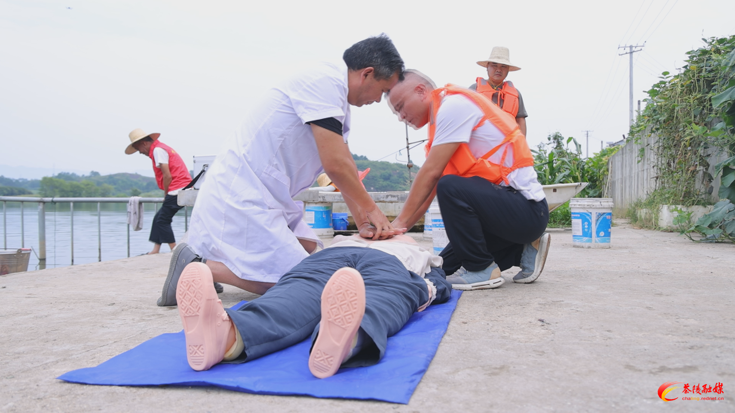 演练模拟无人机巡查时发现有群众游泳溺水,巡逻人员立即上报,应急指挥中心接报后,迅速启动应急预案,组织救援队伍赶往现场。现场巡逻人员率先在附近取竹竿、救生圈、浮力绳展开救援,待应急队抵达后,立即将"落水者"转移至岸上平坦区域。随后,医疗组现场演示溺水急救流程,对落水者进行生命体征检查和心肺复苏等规范操作。整个演练过程紧张有序、配合默契,充分检验了应急处置能力,达到了预期效果。
