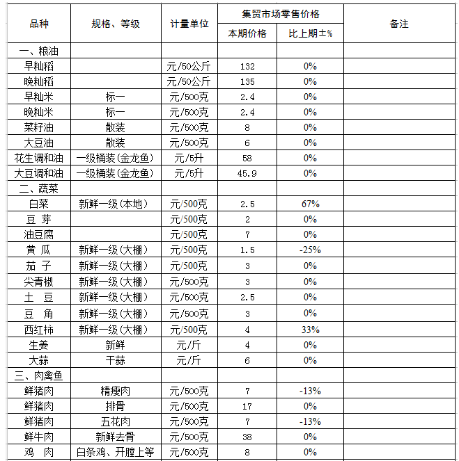 注:采价点为中心农贸市场。 附注:粮油食品价格涨跌情况说明: 1、粮油价格与上期基本持平; 2、蔬菜价格中白菜和西红柿因供需影响价格上涨; 3、肉禽鱼类价格中,猪肉因生猪价格的持续下跌价格下降。