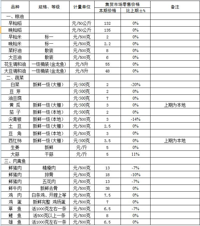 2、蔬菜中除白菜、青椒、大蒜受供需影响价格略有波动,其余与上期基本持平;