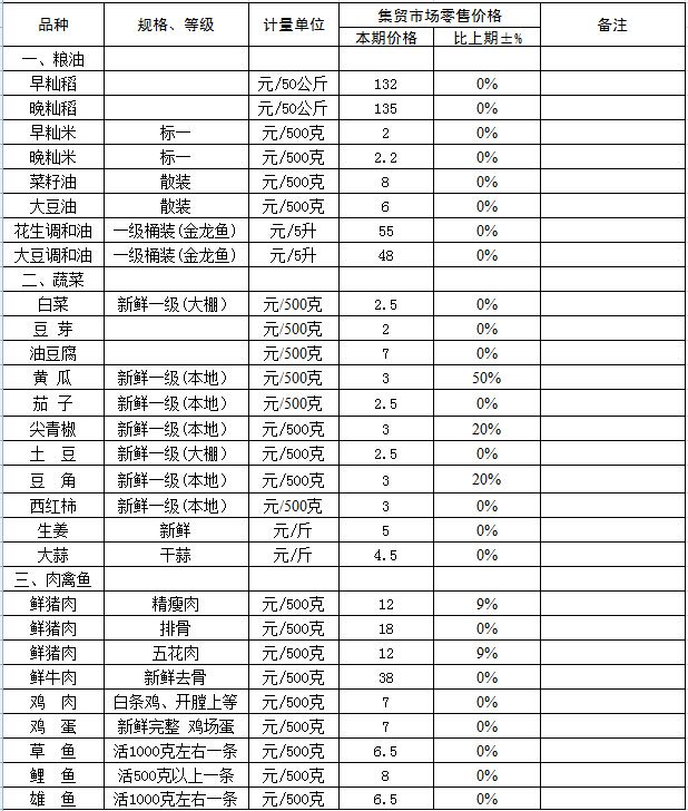2、蔬菜中黄瓜、青椒和豆角因本地蔬菜进入生长末期产量减少价格上涨;