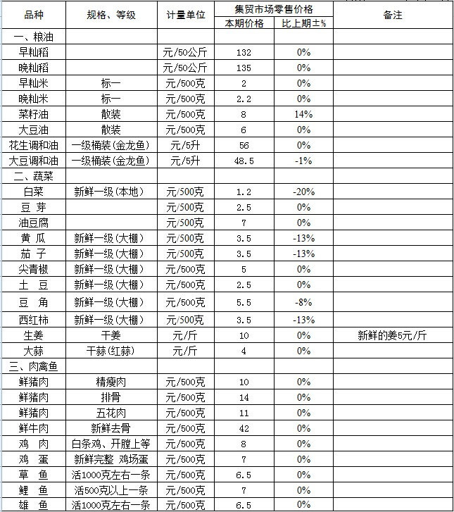 2、蔬菜中白菜因本地白菜大量上市供应量增加价格下跌,黄瓜、茄子、豆角、西红柿价格略有下跌;