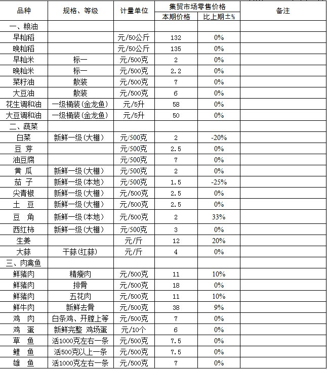 2、蔬菜中白菜、茄子因市场供给量增加价格略有下降,生姜因上游批发价格的持续上升价格上涨;