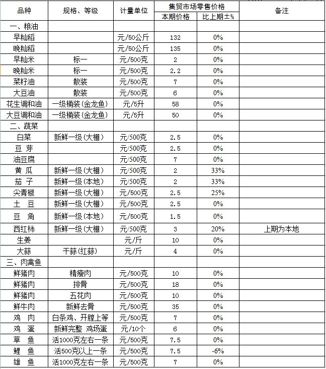 2、蔬菜中黄瓜、茄子、尖青椒和西红柿因本地产量减少,价格略有上浮;