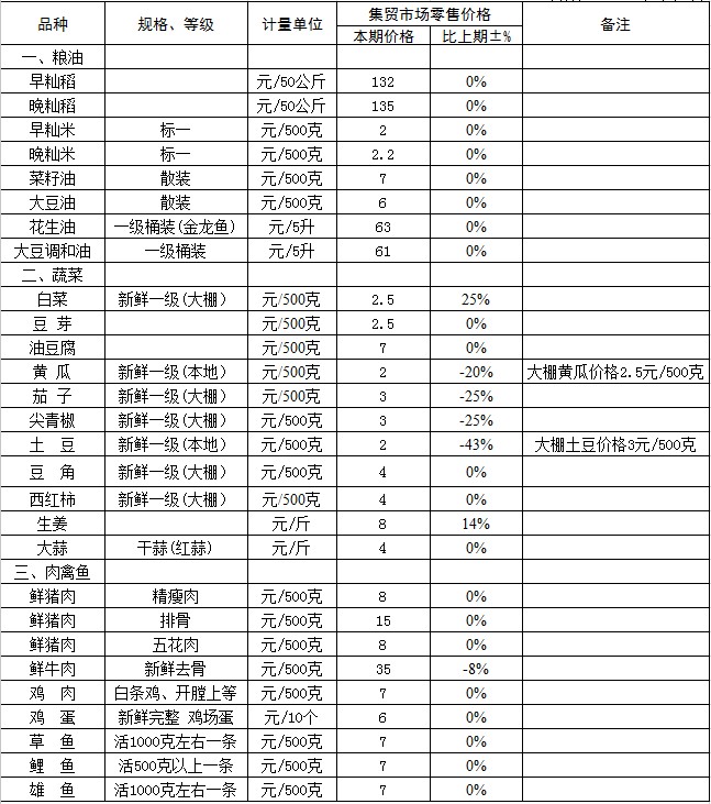 注:采价点为中心农贸市场。 附注:粮油食品价格涨跌情况说明: 1、稻谷价格基本持平。 2、蔬菜价格中生姜和白菜受供给量减少价格上涨,茄子和尖青椒价格略有下降,黄瓜和土豆因本地菜上市价格下跌。 3、肉禽鱼类中牛肉价格略有下跌,其它价格持平。
