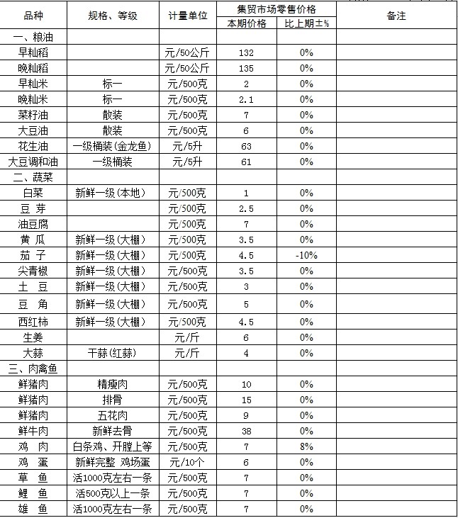 2、蔬菜价格中茄子价格略有变动,其余基本持平。