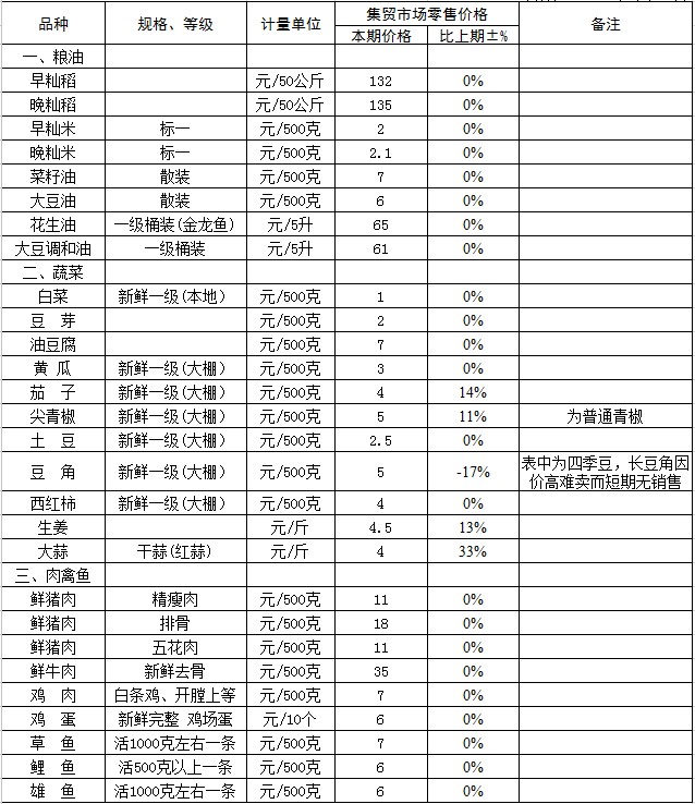 2、蔬菜中茄子、青椒等受需求影响价格略有上涨;四季豆受大棚蔬菜市场供给增多价格稍有回落。