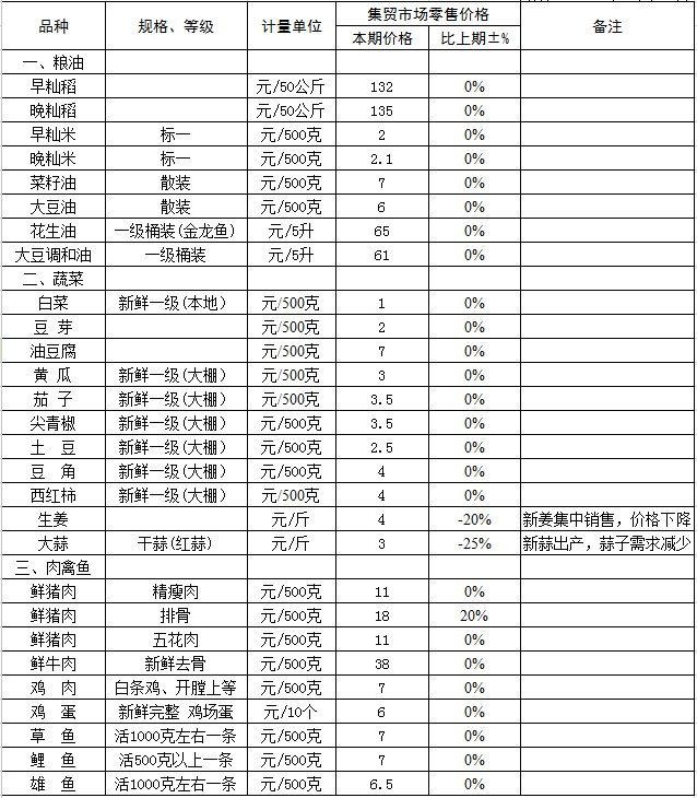 2、蔬菜中大蒜、生姜因供给增多,价格下降;其余基本持平。