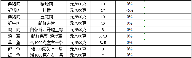 注:采价点为中心农贸市场。 附注:粮油食品价格涨跌情况说明: 1、粮油价格与上期基本持平; 2、蔬菜价格白菜价格因本地菜大量上市价格下降,另茄子、豆角因低温影响价格上升; 3、肉禽鱼类与上期基本持平。
