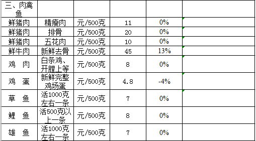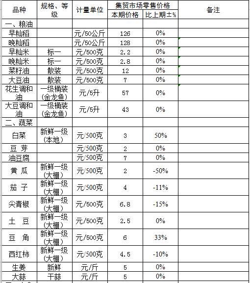 注:采价点为中心农贸市场。 附注:粮油食品价格涨跌情况说明: 1、粮食价格与上期持平; 2、本地蔬菜陆续供应上市,白菜等价格下降幅度较大; 3、牛肉类因供不应求,价格有所上升。