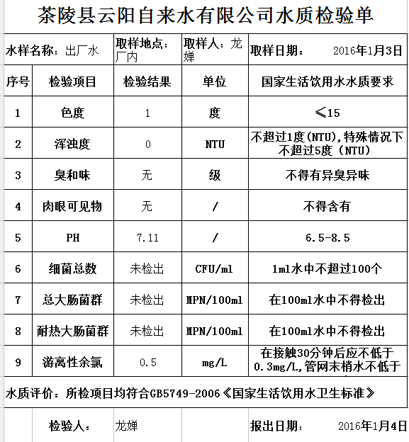 2016年1月3日茶陵县云阳自来水有限公司水质检验单