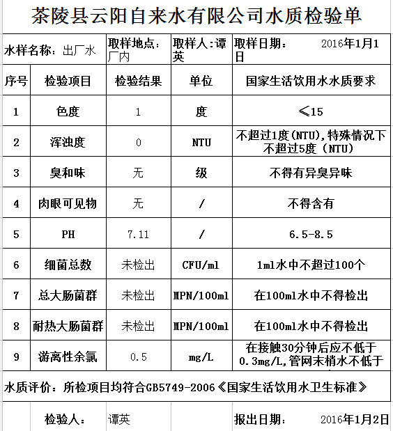 2016年1月1日茶陵县云阳自来水有限公司水质检验单