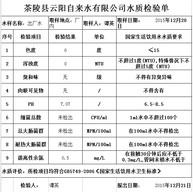 2015年12月20日茶陵县云阳自来水有限公司水质检验单