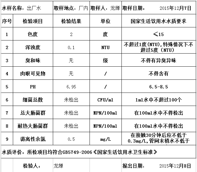 茶陵县云阳自来水有限公司水质检验单