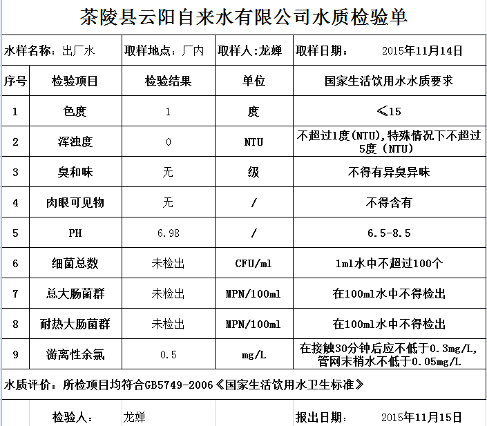 2015年11月14日茶陵县云阳自来水有限公司水质检验单