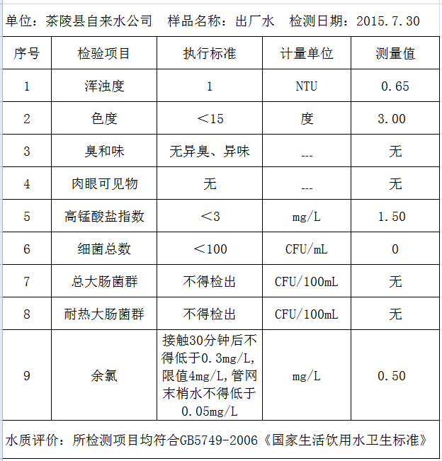 2015年7月30日茶陵县自来水公司水质常规项目检验日报表