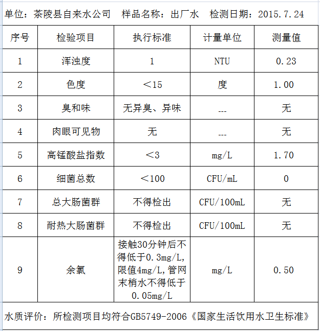 2015年7月24日茶陵县自来水公司水质常规项目检验日报表