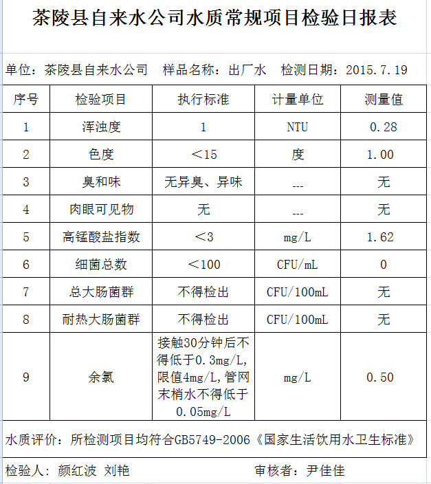 2015年7月19日茶陵县自来水公司水质常规项目检验日报表