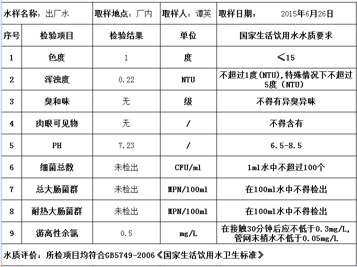 茶陵县云阳自来水有限公司水质检验单