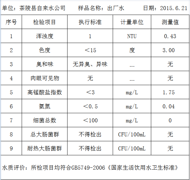 2015年6月21日茶陵县自来水公司水质常规项目检验日报表