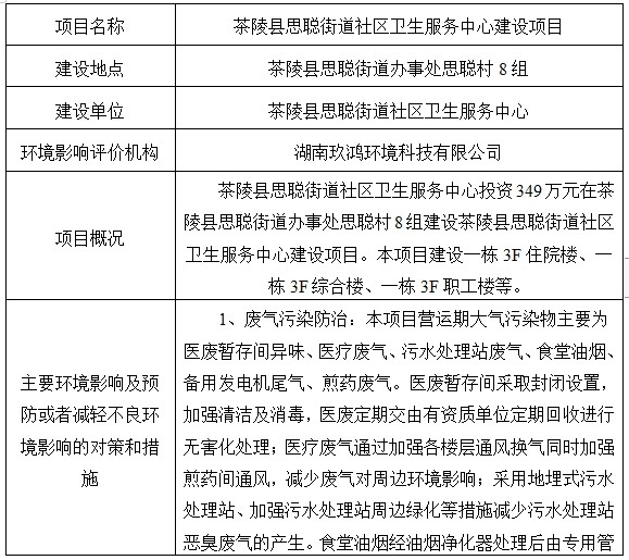 茶陵县思聪街道社区卫生服务中心建设项目环境影响报告表审批前公示