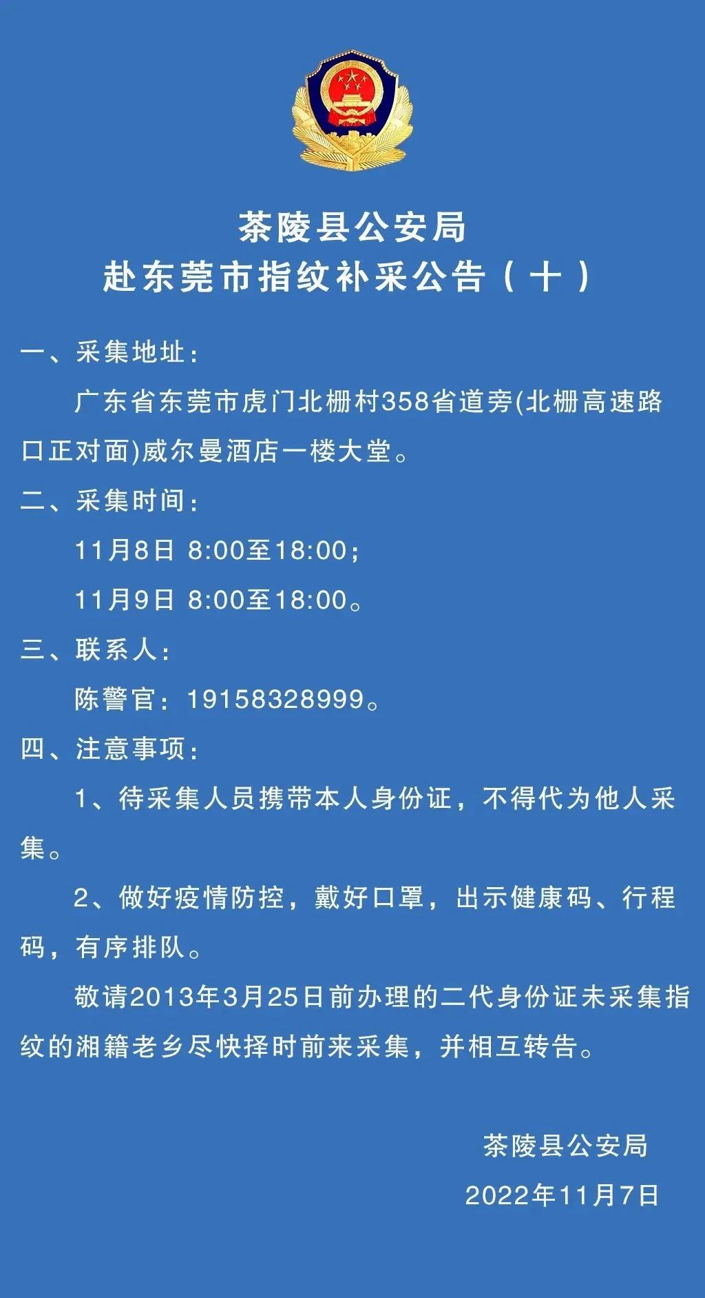 茶陵县公安局赴东莞市——虎门镇指纹补采公告