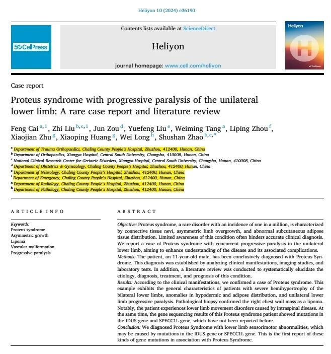 近日,茶陵县人民医院在国际SCI杂志《Heliyon》,以《Proteus syndrome with progressive paralysis of the unilateral lower limb: A rare case report and literature review》为题发表首篇高质量SCI论文,此论文是在赵树山副教授的指导下,由茶陵县人民医院蔡峰主治医师与湘雅医院硕士研究生刘志等人共同完成。据悉,从发表论文代表的学术水平来看,从低到高依次是省级论文、国家级论文、国内核心论文、国际核心论文。其中,国际核心论文常见的就是SCI论文。这标志着茶陵县人民医院在临床及科研领域迈出了具有里程碑意义的重要一步。