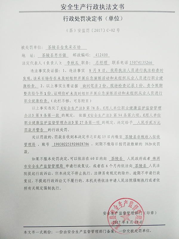 茶陵县金兔采石场行政处罚决定书