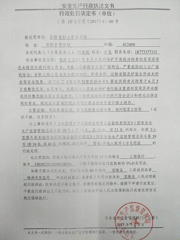 茶陵县杉山亭采石场行政处罚决定书