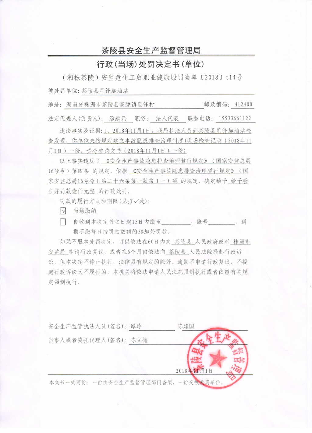 茶陵县星锋加油站行政(当场)处罚决定书(单位)
