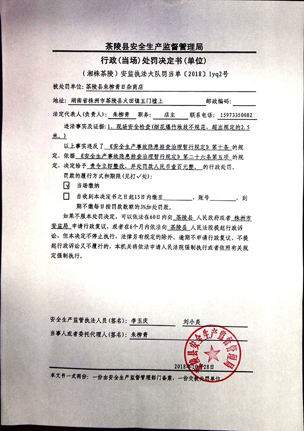 朱柳青日杂商店行政(当场)处罚决定书(单位)