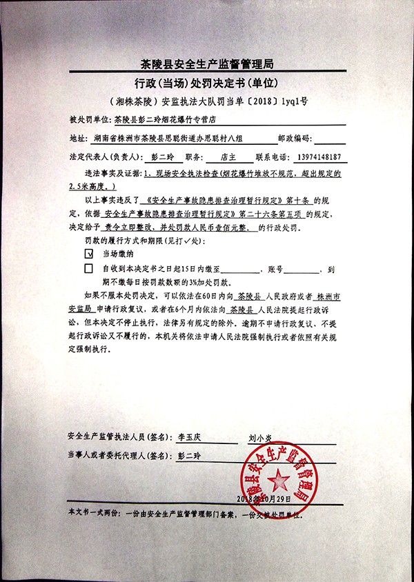 彭二玲烟花爆竹专营店行政(当场)处罚决定书(单位)