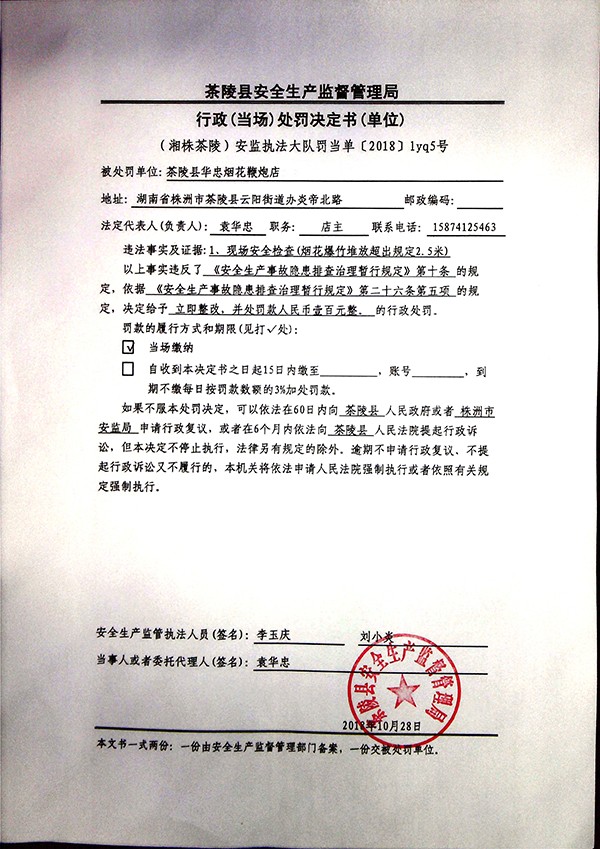 华忠烟花爆竹店行政(当场)处罚决定书(单位)