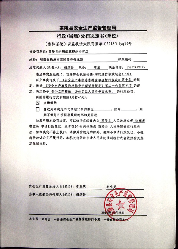 老炳烟花鞭炮专营店行政(当场)处罚决定书(单位)