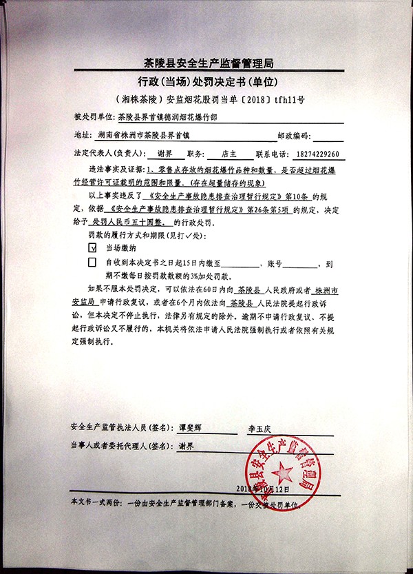 界首镇德润烟花爆竹部行政(当场)处罚决定书(单位)