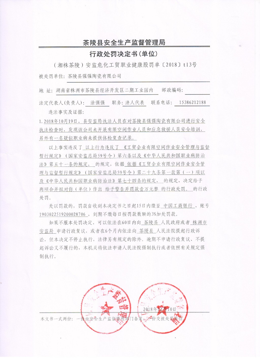 茶陵县强强陶瓷有限公司行政处罚决定书(单位)