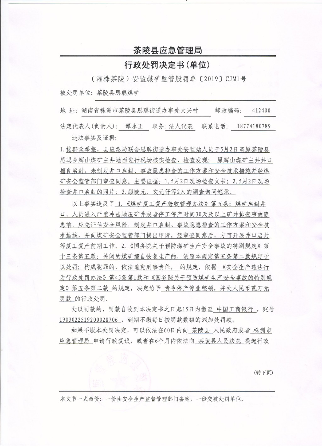 茶陵县思聪煤矿行政处罚决定书(单位)