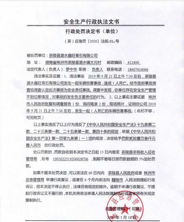 茶陵县潞水鑫旺青石有限公司行政处罚决定书(单位)