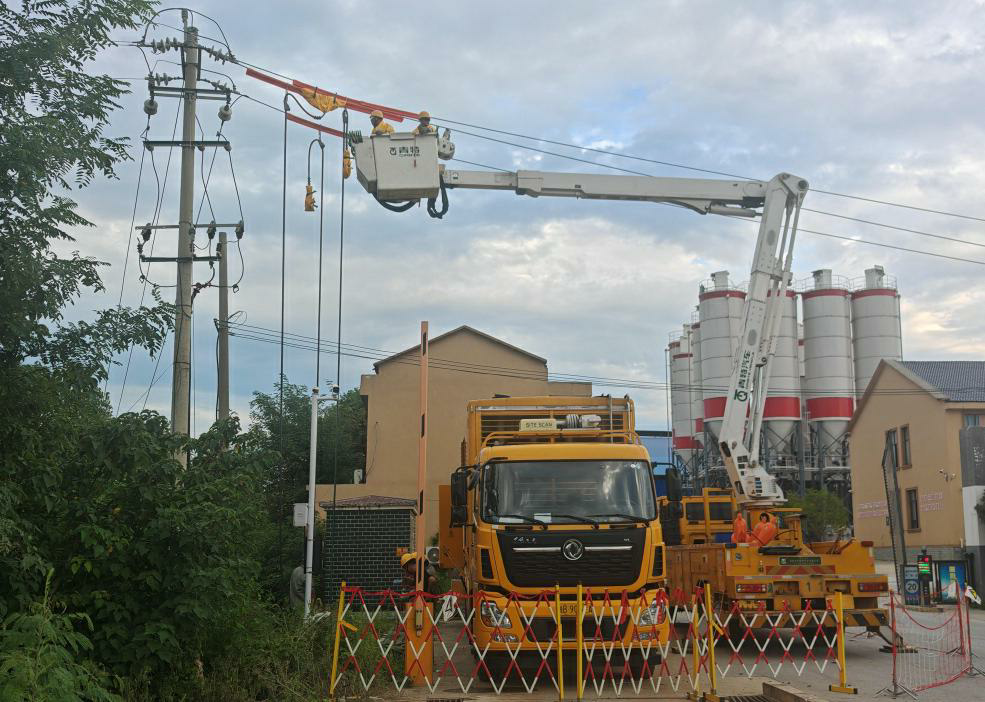 8月22日清晨6点,2台黄色的中央发电车率先抵达枣园村南塘组和枣园村墟上,供电员工迅速展开电缆、连接配电箱,不到1小时就完成了供电切换。与此同时,带电作业车在主线旁升起绝缘斗臂,作业人员身着绝缘服,在高空精准完成支线开关加装;地面上,另一组队员则忙着更换老旧线路和防雷限压器,各环节衔接有序。