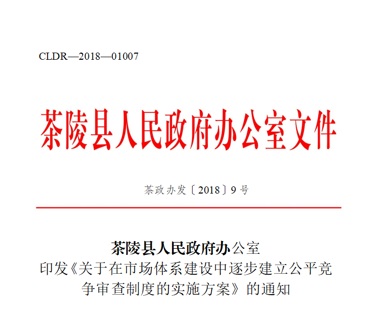 茶陵县人民政府办公室印发《关于在市场体系建设中逐步建立公平竞争审查制度的实施方案》的通知
