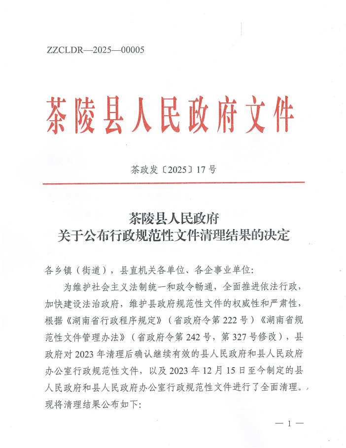 茶陵县人民政府关于公布行政规范性文件清理结果的决定