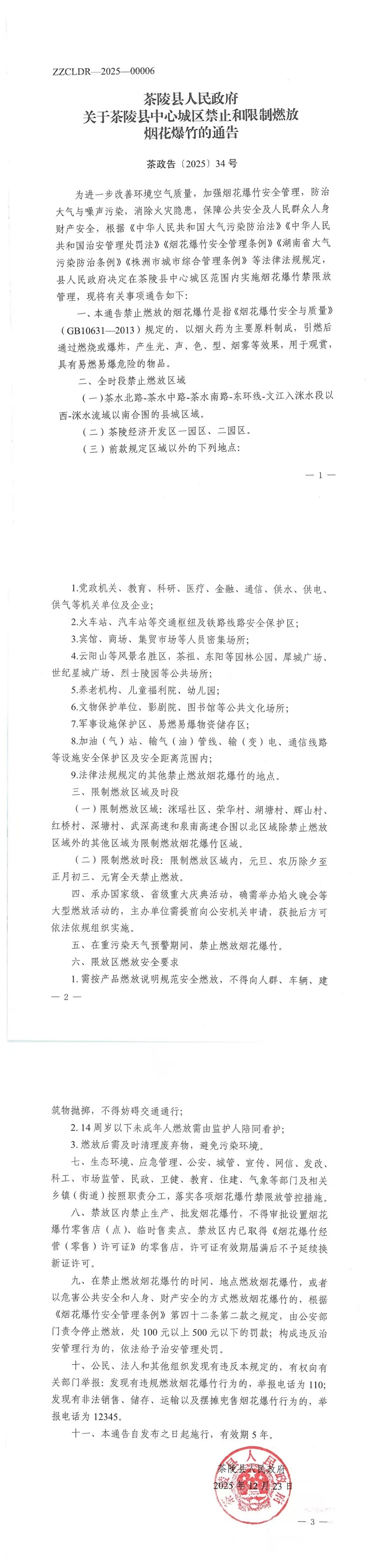 茶陵县人民政府关于茶陵县中心城区禁止和限制燃放烟花爆竹的通告