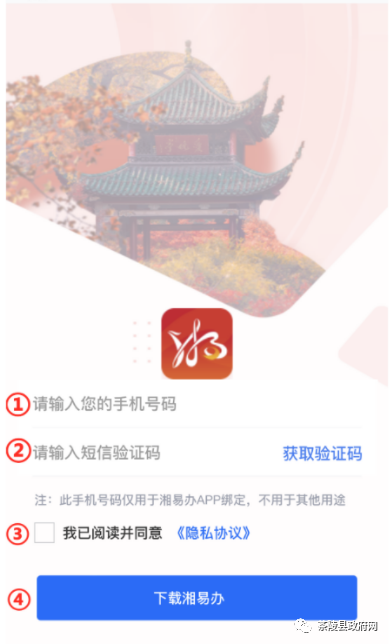 第三步:输入手机号码和短信验证码下载“湘易办”APP。