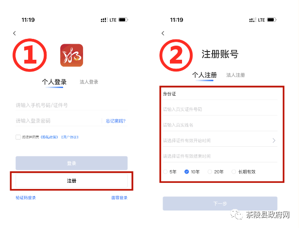第五步:1、点击“注册”;2.填写个人身份信息。