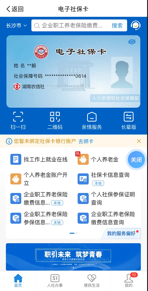 进入“湘易办”APP,在首页金刚区直接找到“电子社保卡”,或是点击“更多服务”,在“常用服务”里选择“人社”分类选项,找到“电子社保卡”,根据页面指引就能成功申领个人“电子社保卡”啦!